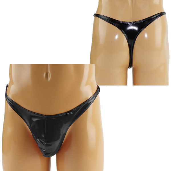 > メンズ エナメル両サイドワンタッチバックル付きTバック ブラック