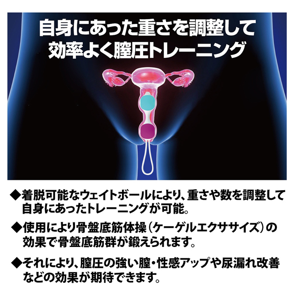 あそこをキュッと引き締め魅力&感度UP!重さ調整可能な着脱式ボールで効率よく鍛えられる膣トレグッズ。日常生活や産後で緩みがちな膣圧をインナーボールでトレーニング♪骨盤底筋群を鍛えることで膣圧が高まり、感度がUPするだけでなく尿漏れ防止やダイエットなど美容面でのプラスにも繋がります。膣トレで貴女の魅力高めて最高の名器をゲットしよう♪高品質なシリコン素材を採用