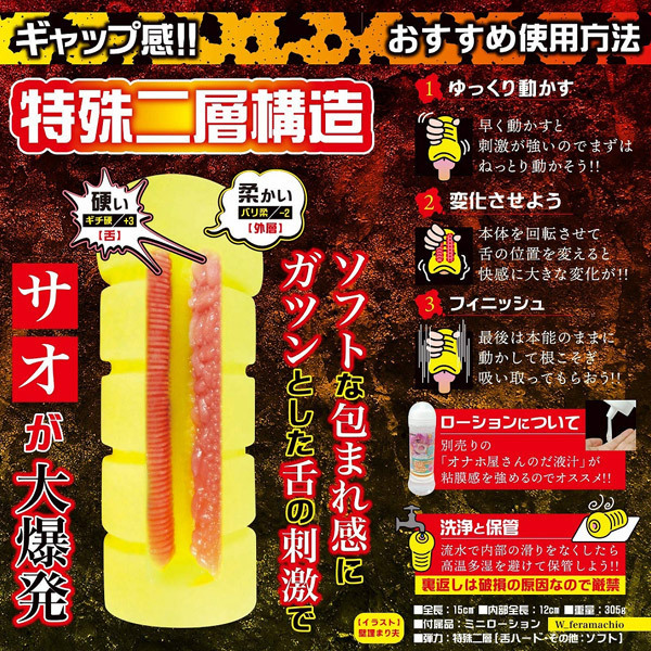 舌だけが固い「特殊二層構造」で大ヒットとなった「フェラ魔チオ」に待望の続編が登場!!ザラついた舌が…這ってゾクゾク ボコついた舌が…絡んでビクビク人では味わえないダブルフェラを楽しめる新感覚オナホール!!でも…気を付けてくださいね?「ダブルフェラ魔チオ」は、舌の感触が特殊な快感のため、オナホ性癖がゆがむ可能性があります※こちらの商品は受注発注商品の為、ご注文から発送までに3、4営業日掛かる場合が御座います。