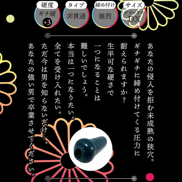 あなたの侵入を拒む未成熟の狭穴。ギチギチに締め付けてくる圧力に耐えられますか?本製品は「ギチ硬(+3)」と呼ばれる硬度を採用しております。これは9種類ある硬度の中で2番目に硬いものです。この素材でしか実現できない強い締まりを再現しました。サイズもスタンダードより一回り大きなものとなり正にデラックス。あなたの全てを受け入れる準備を整えております。※こちらの商品は受注発注商品の為、ご注文から発送までに3、4営業日掛かる場合が御座います。