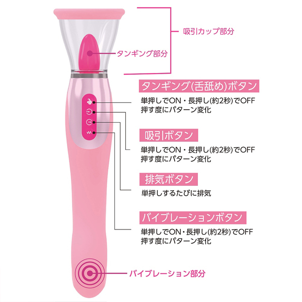 吸って舐めて振動する!欲張りな貴女に送る吸う舐める挿入の3アクションが楽しめる高性能なラブグッズ「ウーマンラブ エアマックス」です。吸引3段階×本格タンギング7種類×振動パターン10種類搭載!個別に楽しんでも良し、吸いながら舐めるといった組み合わせも可能で、舌にアタッチメントを付ければ滑らかな質感を味わうことも◎素材は肌に優しい高級シリコンを採用。吸引機能はやさしく吸われたり舐められるといったリアルなフィーリングが楽しめて、カップはニップル用、クリ用と使い分けが可能。電源はマグネット式で、魔法のステッキのように可愛いUSB充電式だから電池交換の手間もなく、嬉しい生活防水機能を搭載しているのでカップ内のお手入れも簡単です♪