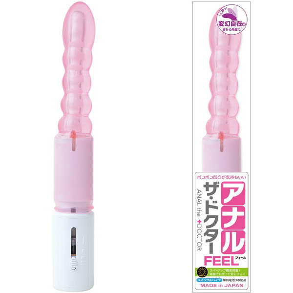 くねっと曲げて刺激!アナル開発に最適な人気のアナルバイブシリーズから好みの角度に曲げられるNEWタイプ「アナル・ザ・ドクター フィール 変幻自在編 ピンク」が登場。こちらの『フィール』は連続する凸凹が気持ちいいお団子ボディが特徴。バイブレーションはスライドスイッチで簡単に調節可能!暗闇で使うと幻想的な雰囲気を楽しめるライトアップ機能も搭載されています。アナル初心者さんでも安心してスムーズに挿入できる日本製アナルグッズです。単四電池3本付属。※仕様変更によりスイング機能は搭載されておりません。