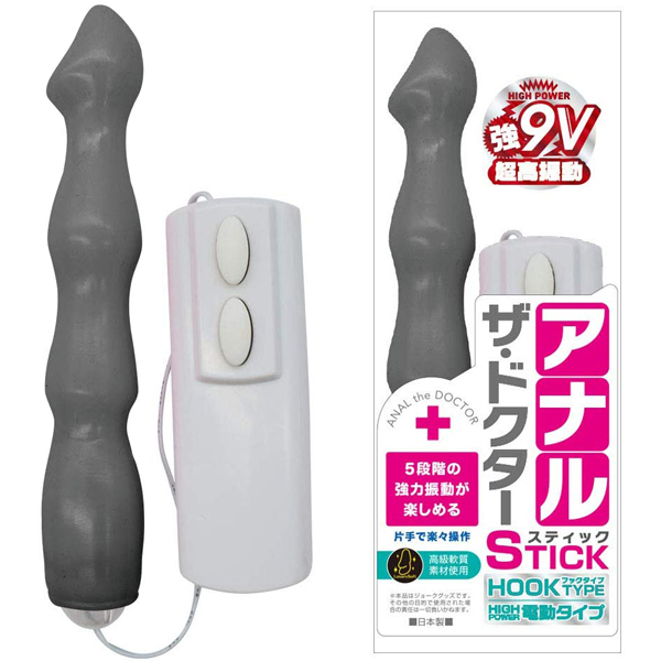 人気の「アナル・ザ・ドクター」シリーズに新作登場!お尻の開発に最適な9V電動タイプの日本製ディルド(黒)。5段階の超強力振動を片手で楽々操作!先端が出っ張った刺激的なフック形状のボディでアナルを開発。高級軟質素材を採用、9V形電池1本を使用