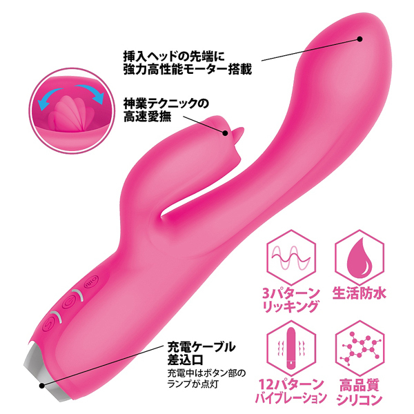 舌先がピンポイントに高速愛撫する生活防水製のUSB充電式バイブ。クリを激しく舐めながら幅広ヘッドでGスポを捉えて徹底刺激♪高性能モーターによる内まで響くような快感振動が全身を駆け巡る!素材には高品質シリコンを採用、密着形状で膣内にぴったりフィット!12パターンの振動と3パターンのリッキング(舐め)が味わえます。