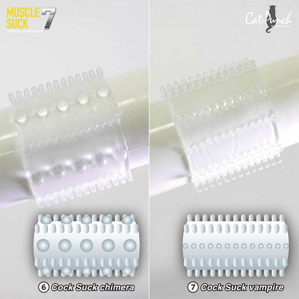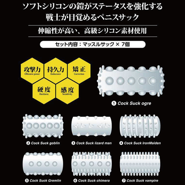 伸縮性が高く締め付け抜群!摩擦力を上げて男をアゲる高級シリコン製のペニスサック7種類セット。悩める男性を徹底的にサポート!持久力を上げるほか、多種多様な刺激でパートナーとのプレイを充実させる♪