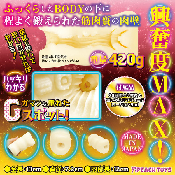 我慢を重ねた女性の膣内を再現した420gの肉厚オナホ。高弾力でハリがあり締まりも抜群!耐久性が高いので奥までしっかりお楽しみ頂けます。ぷくっと膨らむGスポや先っぽを咥え込む子宮口、そして先端をつつく奥突起で貴方の精を搾り取る!高粘度ローション付属。本品と合わせて「20日間オナ禁後の濃いめのラブジュースローション(b30081)」も是非どうぞ♪日本製、非貫通
