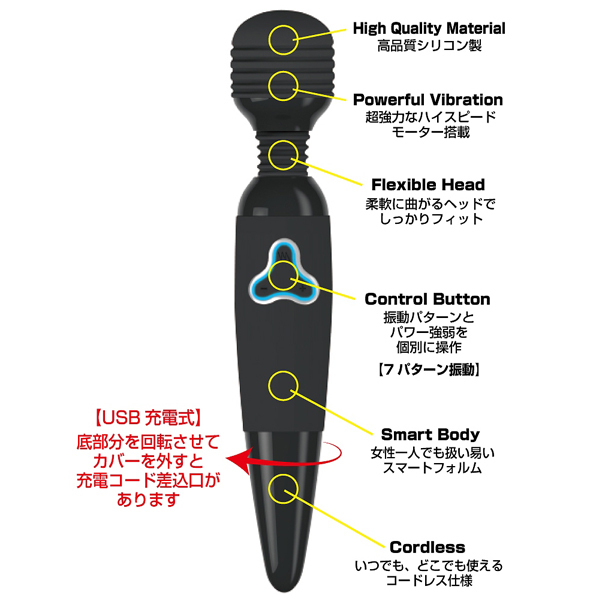 超強力ハイスピードモーターを搭載した、コードレスでも使えるUSB充電式のハイパワー電マ。全長25cm、ヘッドの直径4.5cmの女性の手でも持ちやすいスマート設計!高品質シリコンヘッドは強い振動でも痛くなりにくく、ネック部分は柔軟に曲がるフレキシブルタイプでフィットしやすい仕様に。振動は7種類、強弱調整は個別に操作可能!自宅でも外でも使えるコードレス仕様です。