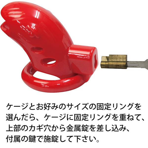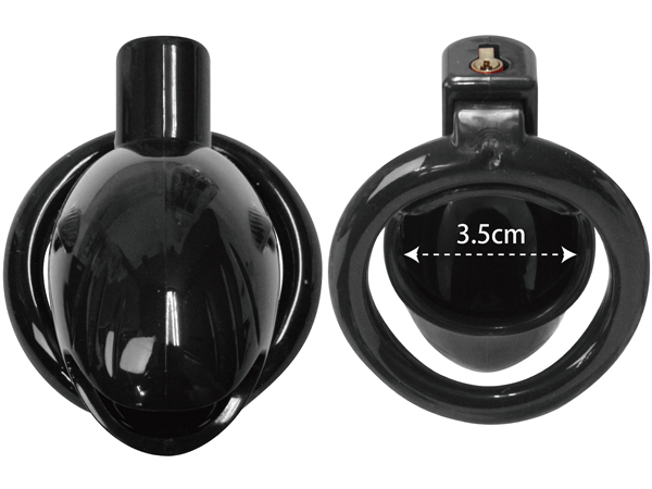 2つのパーツで簡単装着できる機能性に優れたプラスチック製の鍵付き男性用貞操帯。全長7cm、幅3.5cmのケージと3サイズの固定リング(内径4.1cm、4.6cm、5.1cm)で勃起を抑制!鍵を上部に取り付けたことで目立ちにくく邪魔になりにくい♪先端はオープン仕様で装着したままの排泄も可能。管理されたいM男性に◎ブラックカラー