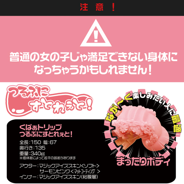 ロングプレイに最適!まったり刺激が楽しめる、つるぷにすとれーと構造の非貫通オナホ。実用性に特化した「くぱぁトリップ」シリーズに新作登場!片手で扱いやすい340g設計で、外はむっちり柔らかく、中は溝無しツルツルなストレート構造♪ねっとり柔らかな膣壁が全体を包み込み、蕩けるような快感を与えます。素材はマジックアイズスキンを使用◎ローション&ケース付