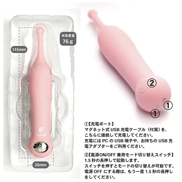 可愛い見た目でテクニシャン♪素肌のように柔らかい触覚でピンポイントに刺激するUSB充電式ローター「キャットパンチ」。10種類の振動パターンとお手入れしやすい生活防水機能を搭載!高周波で高速回転するスピン振動で、乳首やクリなど敏感な部分を責め立てます。先端をぐっと肌へ押し付ければ小刻みに叩くようなアクションも楽しめます◎充電ケーブル付属、ピンクカラー