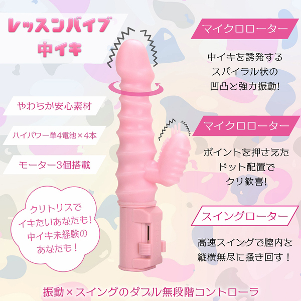【単四電池×4本(付属)】ポルチオ&クリイキのダブル悶絶レッスン!3つのモーターと6Vパワーで、秒ヌレ即イキ!ぷっくり亀頭が膣内をスクリュー回転!快感目指して突き進む!日本女性にフィットするこの形状が、高速スイングで膣内を縦横無尽にかき回します。クリバイブは、ポイントを押さえたつぶつぶと3本の触覚でクリ歓喜!柔らかい亀頭ヘッドがグリングリン膣中を掻き乱してくれるパワフルなスイング回転と、クリを3本の触覚やツブツブで的確に振動刺激するクリバイブでイカせてくれるバイブです!