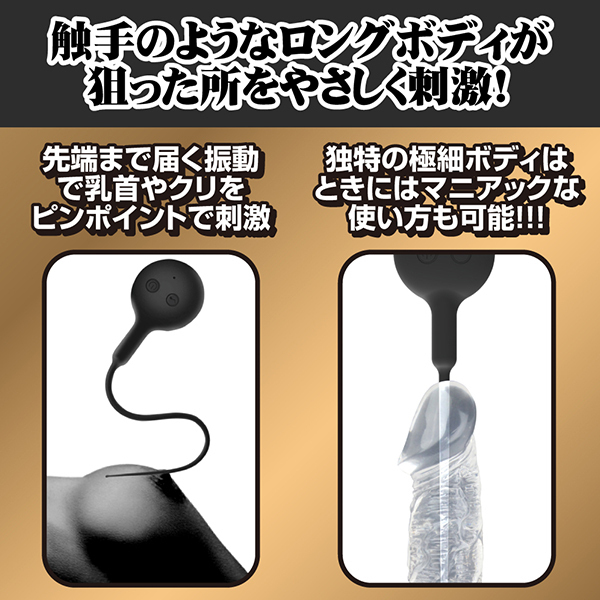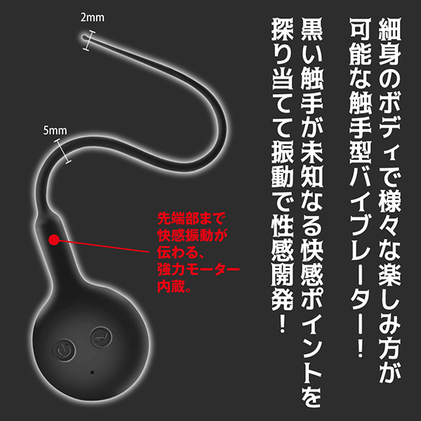 尿道プレイにも大活躍!クリにも乳首にも楽しめる触手のようなローター「ブラックテンタクル」です。7種類の振動パターンを搭載していてIPX6等級の防水性と静音設計が自慢♪コントローラー部分から尻尾のように伸びた触手みたいな部分がくねくねと曲がることで狙いたいところをピンポイントに責めたり刺激することができます!先端部分の太さは2mm、最大でも5mmという太さだから、尿道に挿入しての振動体験など他では味わえない刺激が楽しめます。※尿道に挿入する際は必ず滅菌や消毒を行い衛生面にお気をつけください!素材は高品質なシリコン素材の触手型バイブレーターで給電はUSB充電式です。