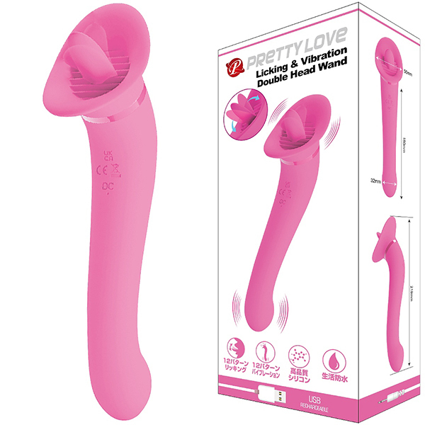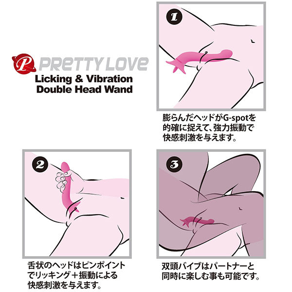 人気のプリティラブフィンガーシリーズから新作が登場!「プリティラブリッキング&バイブレーションダブルヘッドワンド」。見た目も特徴的で、舌舐めしつつ強力な振動が気になるところをピンポイントで刺激!これさえあればパートナーと一緒に楽しめちゃいます♪挿入時には膨らんだヘッドがGスポットを的確に刺激!強力振動で快感刺激を楽しむも良し。舌状のヘッドでピンポイントにリッキングと振動による快感刺激を楽しむこともできます♪高品質シリコン製で12パターンの振動+リッキングで生活防水仕様です。
