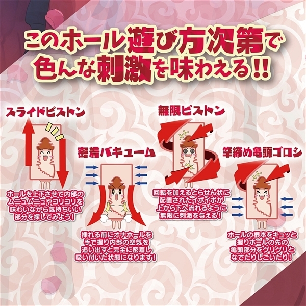 ホール初心者から上級者まで使いやすい定番サイズの非貫通オナホ「僕と淫魔の秘密の契約ノルマは1000発」です。螺旋状に配置されたイボと横ヒダが竿の感度をドンドンアップさせ、淫魔のザー汁絞りが如く亀頭から根本まで「あへあへ」にさせてくれます!特徴的な三段俵責めからスピンイボのスクロール、タコ壺子宮と至れり尽くせり♪3つのゾーンで全く異なる刺激が楽しめる複雑なギミックがあなたを絶頂へと迎えてくれます!