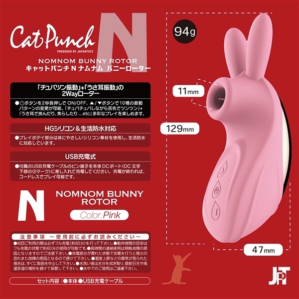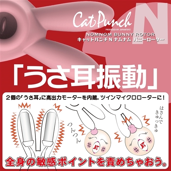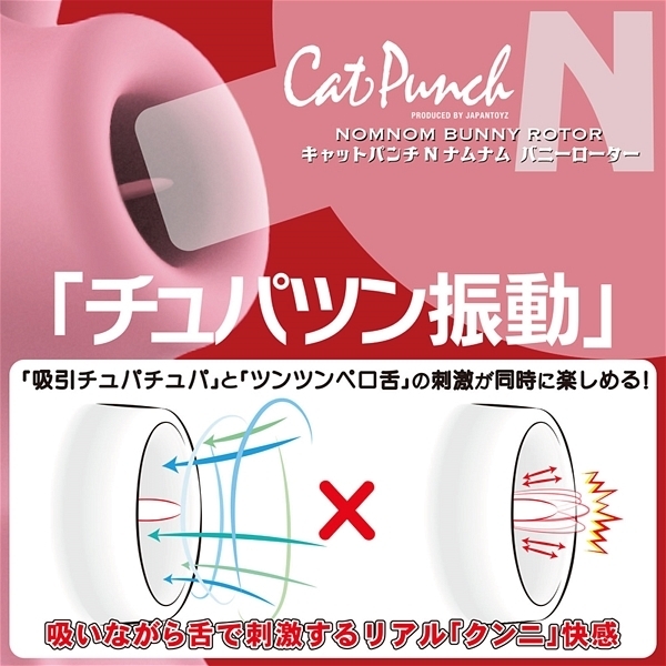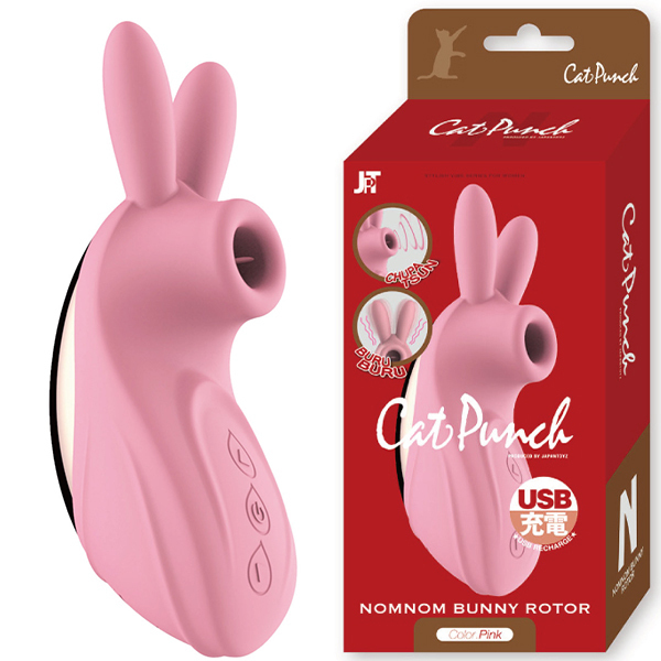 クリトリスに吸い付いてチュパチュパ振動する「吸引バイブ」が究極進化!吸引穴にソフトシリコンのやわらかい「舌」を設置することで、ちゅっちゅと吸いながらの快感やクリトリスを「舌」がツンツンする振動刺激、舐め転がしての愛撫など敏感なトコロを存分に刺激してくれます♪「ウサ耳」には2個の強力振動モーターを内蔵!吸引だけじゃ物足りないという人にぴったりの2wayタイプのローターです。セルフプレジャーアイテムとしてはもちろん、カップルでのご使用にもおすすめです♪電源はUSB充電式。