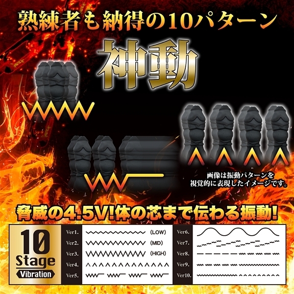 見た目はオブジェのような形状!NOVAシリーズの中でも一番激しいトリッドなアイテムの「バックファイアーNOVA TORRID」です♪入り口は25mmとこれまでのNOVAシリーズの一番太い部分を超えるレベルの太さで最大径は30mm!張り巡らされた縄模様の凹凸が刺激を繰り返しながら角度や向きによっては、また違った快感と刺激を味わわせてくれます♪カラーはシックなブラックでハミ出る肉感的な部分が挿入のアクセントになっています!強弱含め10種の振動機能を備え、単4電池3本で駆動するお手軽さも人気です♪