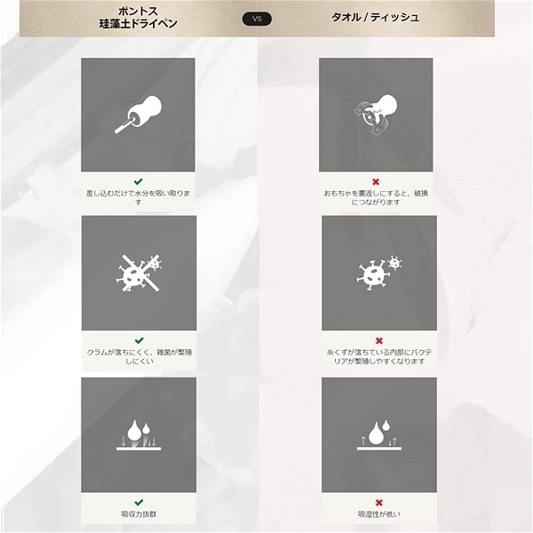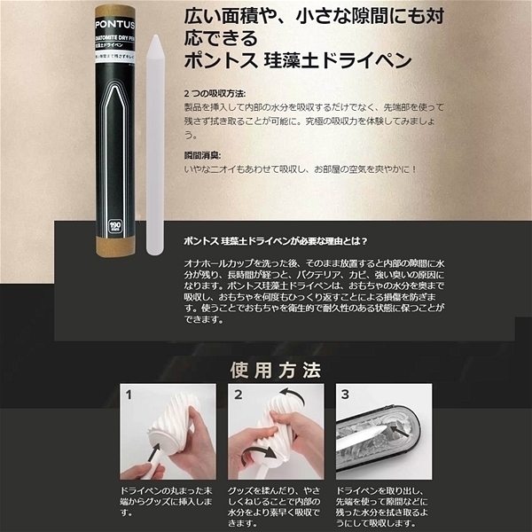 オナホールカップを洗った後そのまま放置すると内部の隙間に水分が残り長時間が経つと、バクテリア、カビ、強い臭いの原因になります。ポントス珪藻土ドライペンは、おもちゃの水分を奥まで吸収し、おもちゃを何度もひっくり返すことによる損傷を防ぎます。使うことでおもちゃを衛生的で耐久性のある状態に保つことができます。