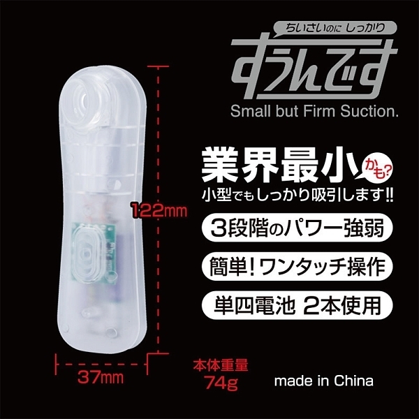 現在、流行中の吸引系ローター。その中でも最小・最軽量・最安を目指して作られたのが、この「すうんです」です。単四電池2本を入れ、電源スイッチ長押しでスタート。あとは電源スイッチを短押しすることで、3段階のパワー強弱をお楽しみいただけます。本製品は小型で簡易的なモデルですが、十分な吸引力を発揮。手軽に、コンパクトに、吸引ロータを楽しむことが可能です。最小・最軽量・最安にこだわった吸引ローター「すうんです」。小型だからと侮らずに、お試しください。●カラー:スケルトンクリア