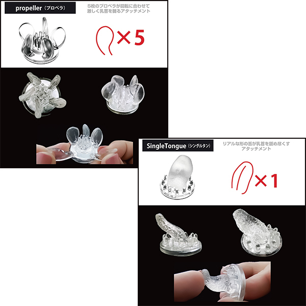 個性あふれる5種のアタッチメントを、両乳首に使えるよう、すべて2個ずつご用意。セットで使うもよし、あえて別々にして2人から乳首責めを疑似体験するのも一興です。●Lily(リリー)リリーの花をイメージした、外側にひらく花びら型のアタッチメント。●Triple Claw(トリプルクロー)内側に向かった3つのツメが特徴的なアタッチメント。●Propeller(プロペラ)5枚のプロペラが次々と乳首を刺激するアタッチメント。●Single Tongue(シングルタン) 小さな舌が回転しながら舐め尽くすアタッチメント。●Ball Cup(ボールカップ)カップの中に大小さまざまのボールが不規則配置されたアタッチメント。●素材:エラストマー※直にお肌と接触する場合は、必ずローション(水溶性)をご利用ください。※こちらの商品はニップルドーム・カップシリーズの交換用アタッチメントです、商品単体ではご使用いただけませんのでご注意ください。