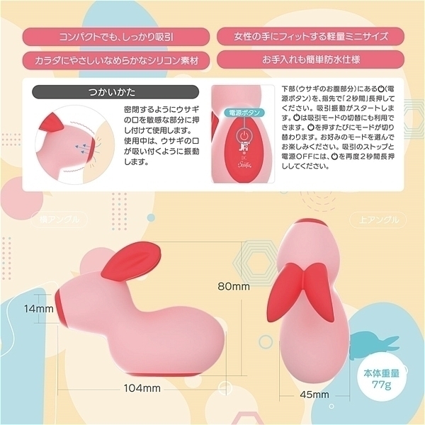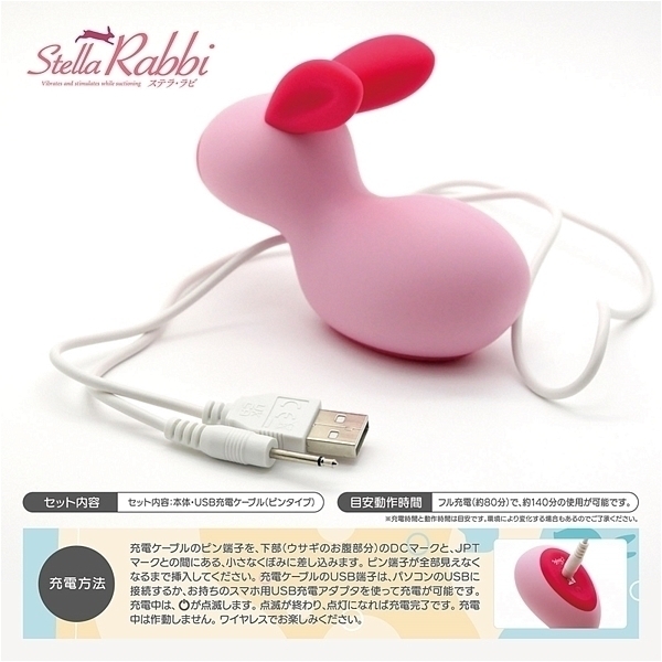 赤ちゃんウサギのちゅっちゅ吸引。女性向け性感プレジャーアイテム「Stella(ステラ)」から、ウサギの人形みたいな吸引バイブがデビューしました。小さなインテリアのようにお部屋になじむ可愛らしさです。14mmの大口径で深さもたっぷりな吸引穴は、かわいい見た目からは意外に思えるほど、深く重い吸引振動を生み出します。満充電なら140分の連続使用が可能です。(充電が切れた状態からの充電は、満タンになるまで約80分必要です)