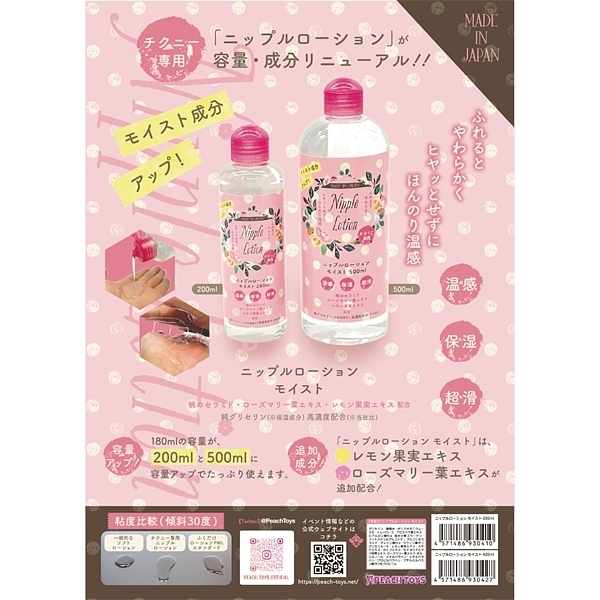 「チクニー専用 ニップルローション(180ml)」が、容量と成分をリニューアルして新発売!!500mlに容量アップでたっぷり使えます。追加成分!「ニップルローション モイスト」は、レモン果実エキス・ローズマリー葉エキスを追加配合!チクニー専用ニップルローションは、ふれるとやわらかくヒヤッとせずにほんのり温感タイプでとても使いやすい商品です。