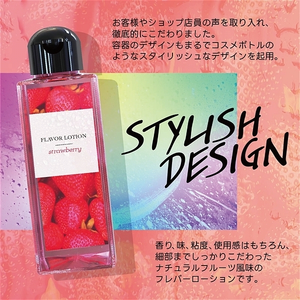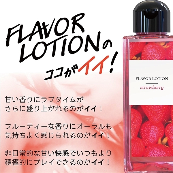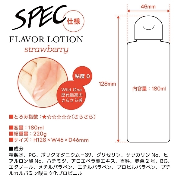 ストロベリー。フルーティーな味と香りで新感覚プレイ!ワイルドワン女子が企画・開発した女性のためのフレバーローション!安心安全の国内素材で水のように「超さらさら」、フルーツみたいに美味しい水溶性ローションです!<成分>精製水、PG、ポリクオタニウム-39、グリセリン、サッカリンNa、ヒアルロン酸Na、ハチミツ、アロエベラ葉エキス、香料、赤色2号、BG、エタノール、メチルパラベン、エチルパラベン、プロピルパラベン、ブチルカルバミン酸ヨウ化プロビニル。※「本製品はバイブバー公式認定ローション 味・香り付き」の後継として開発されましたが味と香り付きという点以外は、成分もテクスチャもまったく異なる新製品です。