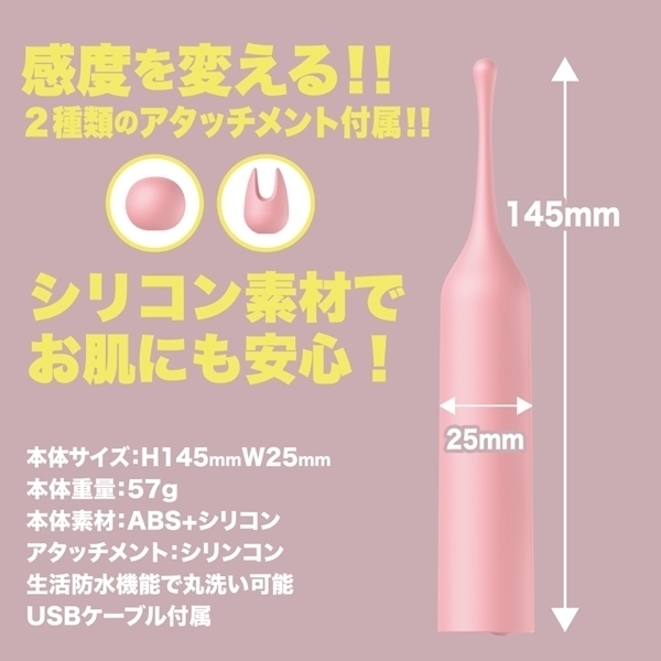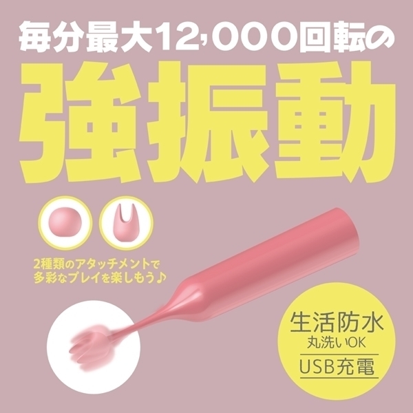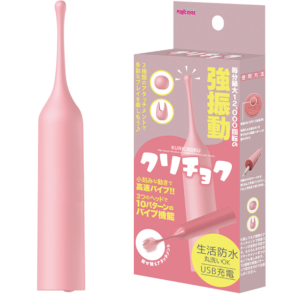 超ピンポイントシリコンヘッドローターのクリチョク。小さなヘッドだから集中した毎分12000回転の強振動を2種のシリコンヘッドを使い分けてお好みの場所で楽しんでください。振動パターンも10種搭載、本体重量57gと超軽量で生活防水タイプの為、丸洗い可能。●カラー:ピンク