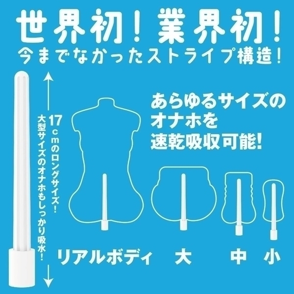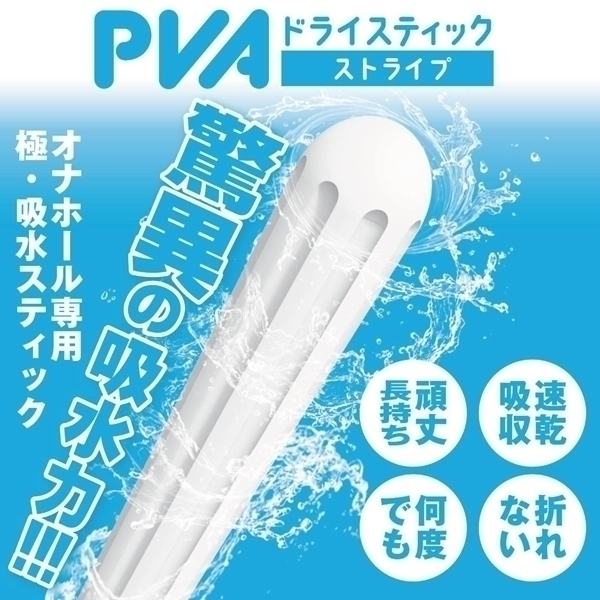 スポンジのように超吸水!プラスチックのようにカタくて丈夫!そしてオナホに合わせた特殊フォルム!硬質PVA素材を採用した、新時代のオナホ速乾ドライスティックが爆誕!軽い!硬い床に落としても傷つかない!濡れても変形しない!なめらか加工でオナホにやさしい!驚異的な吸水量なのに、珪藻土スティックやスポンジ製品の苦手要素をすべて克服。無着色なので、オナホへの色移りもありません。●ストライプ