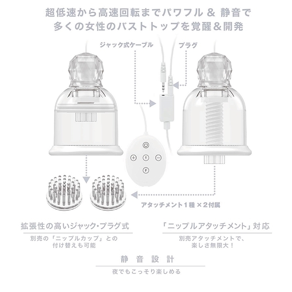 ドームの直径を1.2cmも拡大し、日本女性のほとんどのバストトップをカバーしています。女性にも男性にも幅広いファンを持つ、乳首開発の定番グッズが、ますますユーザー層を拡大すること間違いなし。従来の「ニップルドームR」と機能はまったく同じなので、長年の愛好家もご安心ください。アタッチメントの根元まで押しつけた乳首を深くねぶって停まらない高トルクも健在。