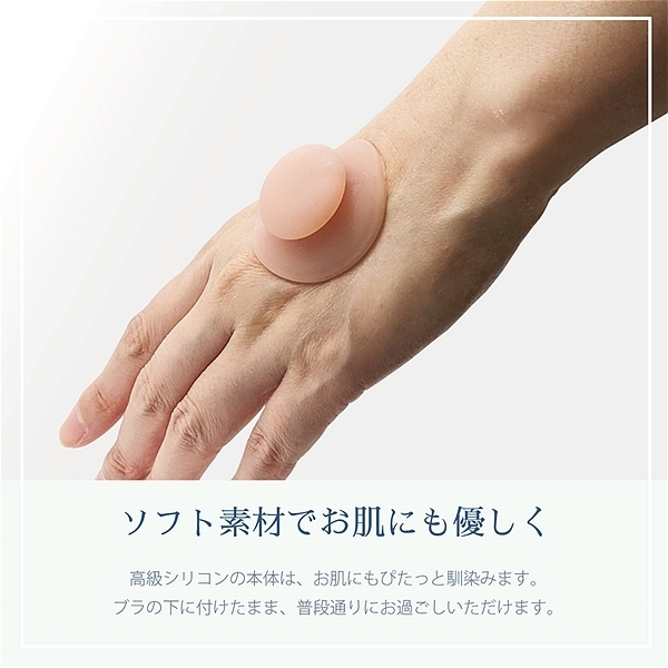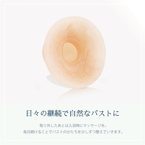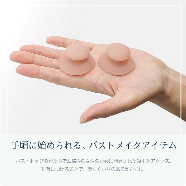 バストトップのかたちでお悩みの女性(陥没乳首や出産後など)のために…実用新案登録された、優しいソフト素材の痛くない吸引ケアグッズです。少量のローションを塗布し乳首につけることで、美しくハリのあるかたちに近づけていきます。ブラの下に付けたまま、普段通りにお過ごしいただけます。取り外したあとは入浴時にマッサージし、毎日続けることでかたちを整えていきます。