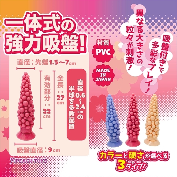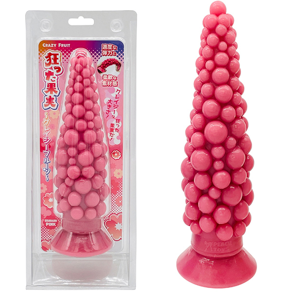 クレイジーな大きさ!狂った果実だ!『狂った果実 クレイジーフルーツ』の登場です。異なる大きさの粒々が刺激!全長27cmの巨大ディルド。先端は小さく、段々と広がる円錐形状に大きさの異なる粒々がランダムに配置!直径0.6〜2.4cmの半球を多数配置●カラーと硬さが選べる3タイプ!柔らかな素材感!<スタンダードピンク>ピンクのスタンダードタイプ。適度な弾力と柔軟な素材感!
