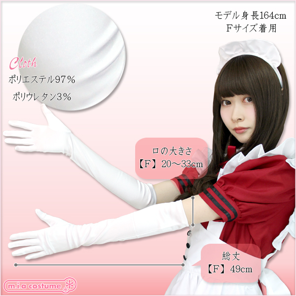 プリンセスドレス、メイド服、チャイナドレスなどのコスプレやワンピースにも合わせられるロング手袋(白)。サテン生地なので高級感もUP!きちんと手にフィットし、着け心地もとってもいい感じです!長さは肘上くらいになります。※水洗い可、塩素系漂白剤による漂白不可、ドライクリーニング可。※こちらの商品は在庫の状況によりお届けまでに4日〜7日程度かかる場合がございます。