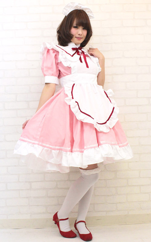 ピンクに馴染む白が乙女チックなワンピースのメイドさん衣装。ふわりと広がるスカートの裾にフリルをプラス!パフスリーブで更に愛らしく、エプロンの肩口も大胆なフリルでふんわりと。カチューシャも存在感のある仕上がりで、砂糖菓子みたいなメイドさんに大変身!セーラー風の襟と襟元の赤いリボンが目を惹く、デザイン性の高いメイド服コスチュームです!※水洗い不可、塩素系漂白剤による漂白不可、アイロンは中温で当て布使用、ドライクリーニング可、色落ちの可能性があります。※こちらの商品は在庫の状況によりお届けまでに4日〜7日程度かかる場合がございます。