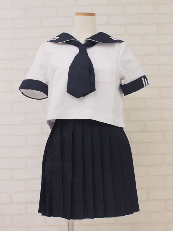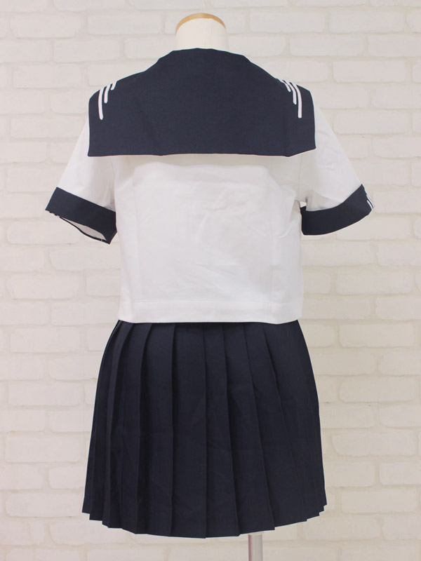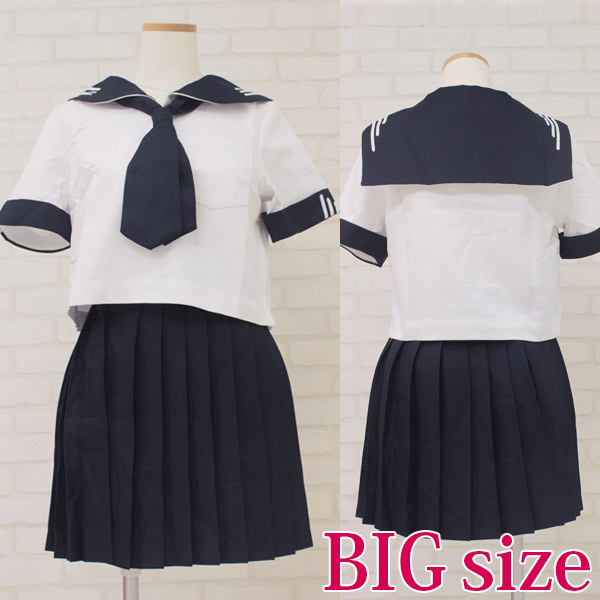 個性的な3本ラインがポイントになった、私立女子学園の半袖セーラー服(BIG)。夏服仕様のセーラーブラウスにプリーツスカート、紺色スカーフのセット!セーラー襟と袖のデザインがお洒落なお嬢様風制服コスチュームです。※水洗い不可、塩素系漂白剤による漂白不可、アイロンは中温で当て布使用、ドライクリーニング可、色落ちの可能性があります。※こちらの商品は在庫の状況によりお届けまでに4日〜7日程度かかる場合がございます。
