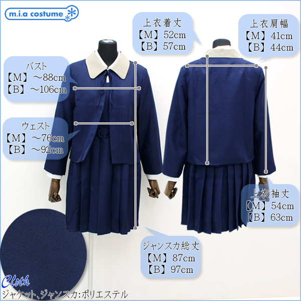 セット内容:ジャケット(襟取り外し可・肩パッド入り)、丸襟ブラウス(前開き・ボタン留め)、ジャンパースカート(バストからウエスト部分に肩ボタンとサイドボタンで着脱可・ベルト取り外し可)、ベルト※クラシックな雰囲気漂うボレロが可愛らしい制服コスプレ(M)。中に着たジャンパースカートは、ハイウエストのノースリーブタイプ!ボレロの襟とリボンがお洒落のポイントになっています!リブハイソックスやタイツと合わせて着こなしたい、お嬢様学校風の制服コスチュームです。※水洗い不可、塩素系漂白剤による漂白不可、アイロンは中温で当て布使用、ドライクリーニング可、色落ちの可能性があります。※こちらの商品は在庫の状況によりお届けまでに4日〜7日程度かかる場合がございます。