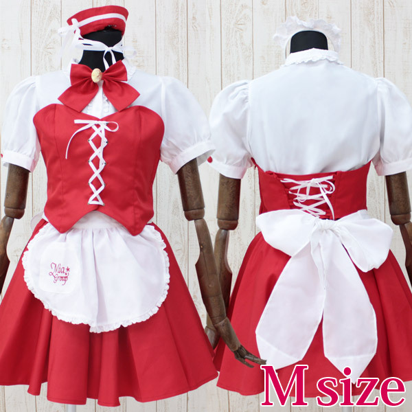 苺ショートケーキ風?!赤と白の甘いテイストで着こなすスイーツ系のメイドコスチューム。有名なカフェのオフィシャル制服!白い半袖ブラウスにレースアップビスチェがセクシー!大きな後ろリボンが可愛い丸エプロン、フレアスカートの下にはレースペチコート、襟にはカメオ付きリボンブローチをトッピング!そしてヘアアクセはカチューシャとミニセーラー帽のどちらも楽しめるメイドコスプレの豪華8点セットです。※水洗い不可、塩素系漂白剤による漂白不可、アイロンは中温で当て布使用、ドライクリーニング可、色落ちの可能性があります、ご注意ください。※こちらの商品は在庫の状況によりお届けまでに4日〜7日程度かかる場合がございます。