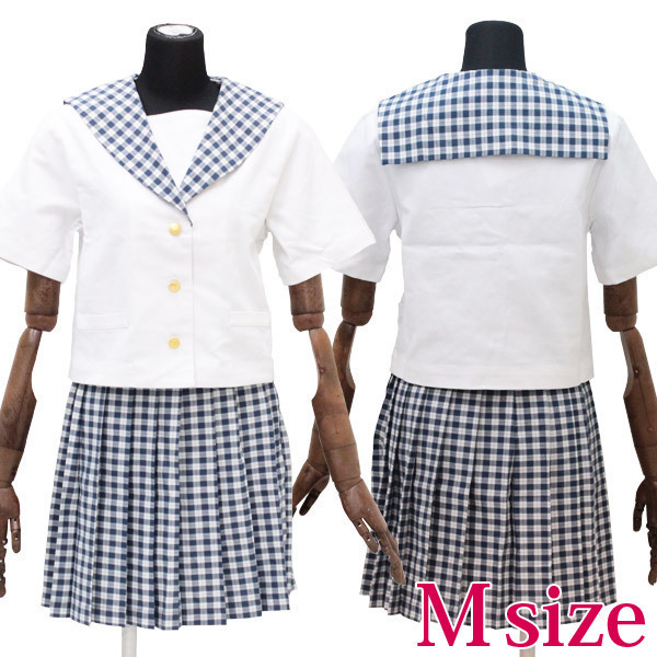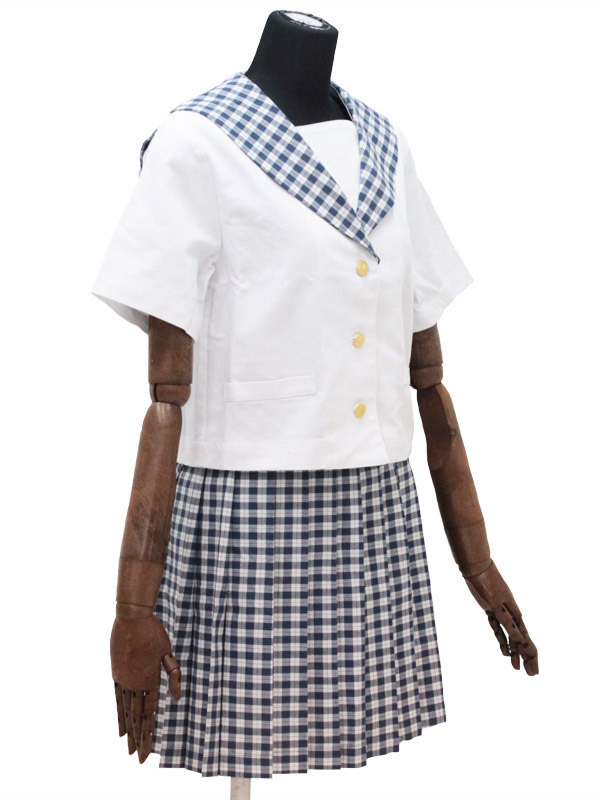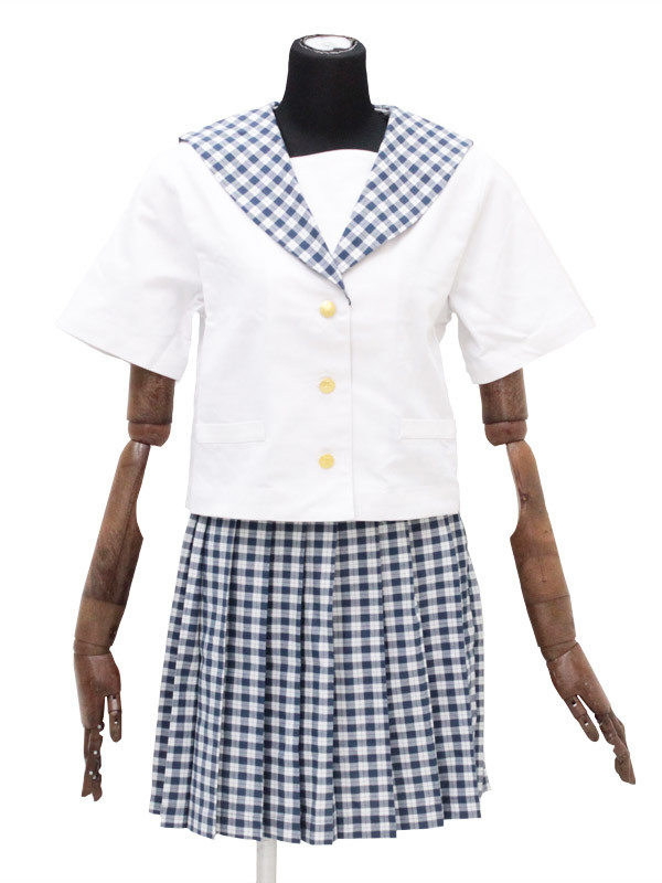 ギンガム風のチェックが爽やか!上品なムードをかもし出すセーラー服コスチューム。●真っ白なブラウスに映える蝶デザイン入り金ボタン●細かなチェック柄で夏らしく清涼感たっぷり●襟とお揃い柄のスカートでエレガントな統一感。暑い日差しの中でもクールに着こなせちゃいそう!お嬢様のような清楚な雰囲気が漂う夏用制服です。※水洗い不可、塩素系漂白剤による漂白不可、アイロンは中温で当て布使用、ドライクリーニング可、色落ちの可能性があります、ご注意ください。※こちらの商品は在庫の状況により、お届けまでに4日〜7日程度かかる場合がございます。