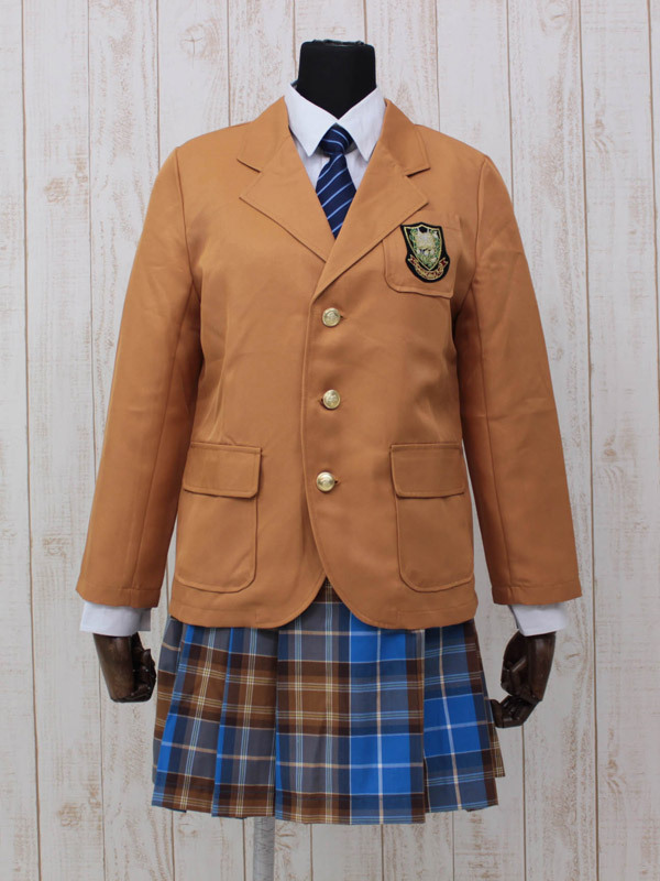 中高一貫のお嬢様気分を味わえそう♪キャメル色のブレザーがオシャレな冬用スクール制服。●フロントを金ボタンで留めるキャメルブレザー●胸ポケットに紋章風の刺繍ワッペン付き●6つの金ボタンがあしらわれた青×キャメルのチェックスカート●斜めストライプ柄ネクタイも付いた4点セット。他の制服とは異なる個性的カラーがバツグンに可愛い!周りに差をつけたい方にオススメな長袖制服コスチュームです。※水洗い不可、塩素系漂白剤による漂白不可、アイロンは中温で当て布使用、ドライクリーニング可、色落ちの可能性がありますのでご注意ください。※こちらの商品は在庫の状況によりお届けまでに4日〜7日程度かかる場合がございます。