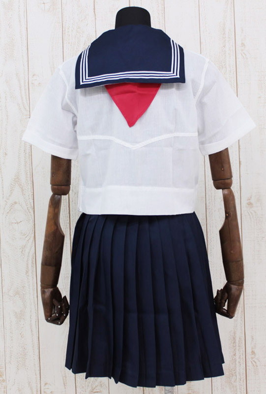 昭和っぽいデザインがキュート!私立学院のお嬢様風制服コスチューム。●切り替えが珍しい白の半袖トップス●首元が詰った紺色セーラー襟で真面目感アップ●襟元よりかなり下方にスカーフ留めを配置●一部ゴム入り・ウエストにフィットする膝丈紺色プリーツスカート。小さな襟と幅広に見える三角スカーフのギャップが可愛い制服コスプレセットです。※水洗い不可、塩素系漂白剤による漂白不可、アイロンは中温で当て布使用、ドライクリーニング可、色落ちの可能性があります、ご注意ください。※こちらの商品は在庫の状況によりお届けまでに4日〜7日程度かかる場合がございます。