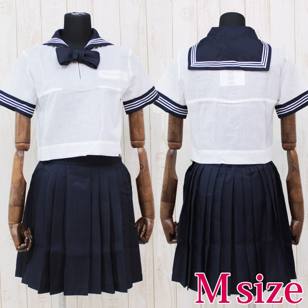 蝶ネクタイ風に結んだミニリボンがキュートな夏服タイプのセーラー服コスプレ。●爽やかな半袖セーラーブラウス&紺色スカート●セーラー襟&袖に3本の白ライン入り●可愛らしい小ぶりな紺色リボン。襟、リボン共に主張しすぎない控えめサイズでも、しっかりデザイン性をキープした制服コスプレです。※水洗い不可、塩素系漂白剤による漂白不可、アイロンは中温で当て布使用、ドライクリーニング可、色落ちの可能性があります、ご注意ください。※こちらの商品は在庫の状況によりお届けまでに4日〜7日程度かかる場合がございます。