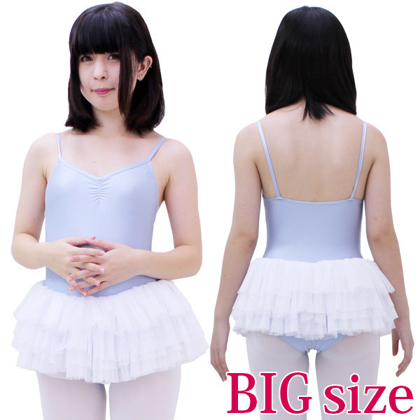 萌えカワバレリーナに変身♪可愛らしさがギュッと詰まったスカート一体型レオタード。●爽やかなパステルブルーカラー●スッキリ美しいキャミソール型●ギャザーでフィット感◎な胸元●デコルテを強調させるV字ネック●ボディの一部に当て布加工あり●ふんわり重ねたホワイトチュール●スカート部分は縫い付け済み●男性も着られる大きめサイズ。大きく開いた背中&デコルテで女性らしさをアピール!すっきり着られるキャミソールタイプのレオタードコスチューム。ふわふわひらひらと優しげに揺れるチュールスカート付きで、重ね着ナシでもしっかり可愛いです。※水洗い不可、塩素系漂白剤による漂白不可、アイロンは中温で当て布使用、ドライクリーニング可、色落ちの可能性があります、ご注意ください。