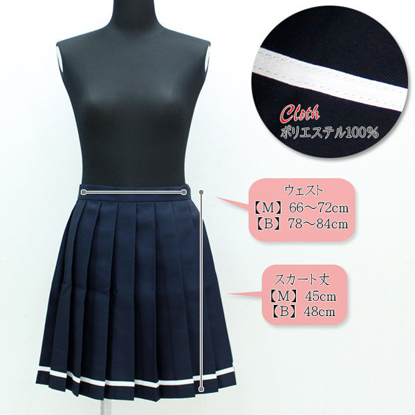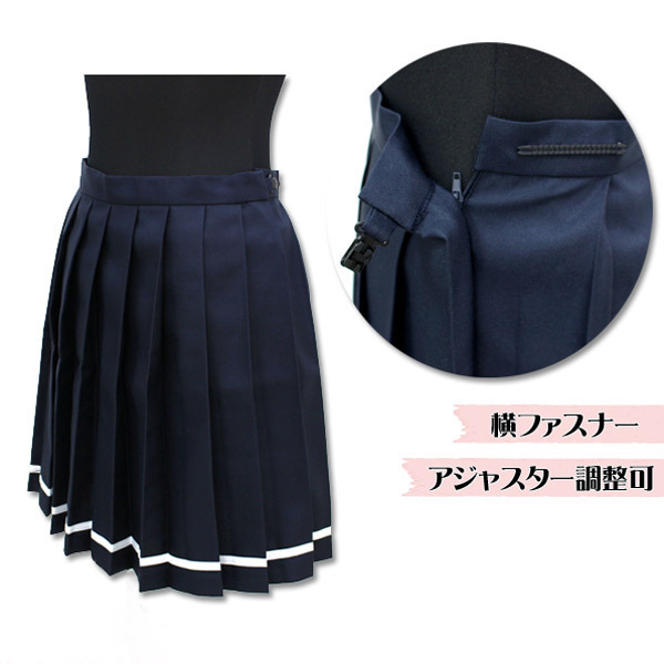大人気の制服スカートシリーズに裾ライン入りモデルの「無地プリーツスカート単品 紺×白ライン BIG」が登場。様々なトップスとあわせやすいネイビーカラーのスカートは、一着持っていると何かと便利なコスプレアイテム。白シャツで清楚に、ポロシャツとあわせてカジュアルに!ブレザーやカーディガンとあわせても◎♪もちろんセーラーブラウスとも相性抜群!様々なイベント用のコスチュームにも使える優秀アイテムです。※水洗い可、塩素系漂白剤による漂白不可、アイロンは中温で当て布使用、ドライクリーニング不可、色落ちの可能性があります。