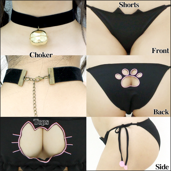 貴方だけのセクシーな黒猫に変身♪フリル×猫モチーフのキュートな水着が登場!まるでアニメコスチュームでありそうな、猫モチーフを所々に入れたデザインの水着♪胸の中央部、ショーツフロントには猫の顔、お尻とショーツ紐には肉球、さらに鈴付きのチョーカーでより猫感をプラス。ブラにはフリルがあしらわれていて、女の子にとってはたまらないデザインとなっています♪別途、猫系の仮装グッズを取り入れると更に猫感が増すかも♪ハロウィンやコスプレイベントにおすすめです!※水洗い可、塩素系漂白剤による漂白不可、アイロンは中温で当て布使用、ドライクリーニング可、色落ちの可能性があります。