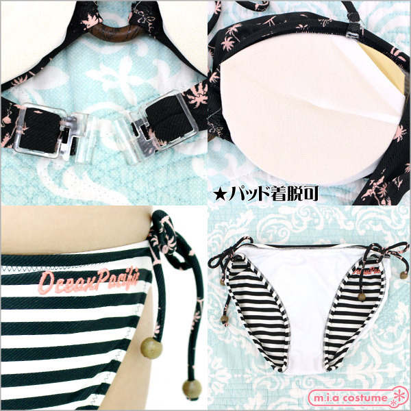 9Mサイズ:B83cm・H87〜95cm セット内容:トップス(パッド着脱可、ワイヤー無し)、ビキニショーツ 素材:ポリエステル85%、ポリウレタン15% 生産国:日本