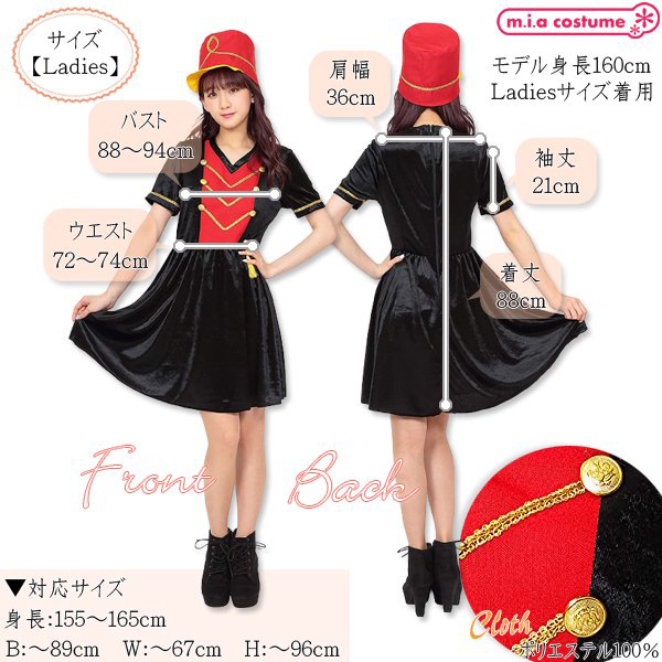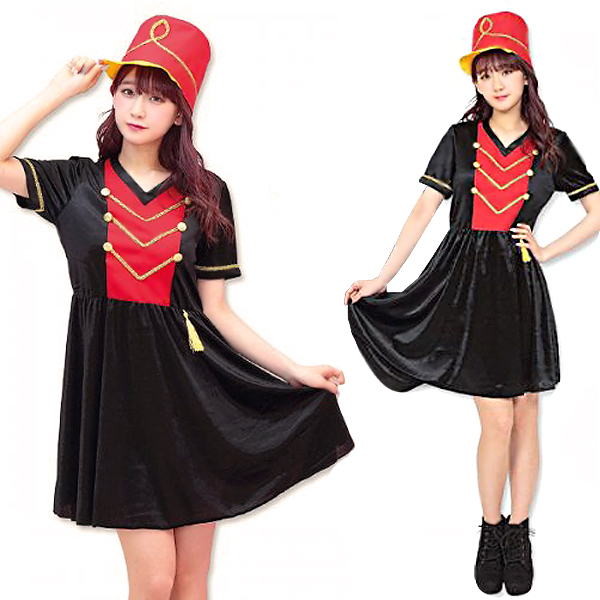 演奏会の衣装やイベント行事に!光沢のある柔らかな生地を使用した赤×黒のマーチングガールコスプレ。黒ベースのV字ネックワンピに赤を加え、金の装飾を施したクラシックなデザイン!大きく高さのある帽子を被れば貴女も立派なマーチングガールに変身♪背面ファスナー式で裏地はありません◎Fサイズ※洗濯不可、塩素系漂白剤による漂白不可、アイロンは中温で当て布使用、ドライクリーニング不可※こちらの商品は在庫の状況によりお届けまでに4日〜7日程度かかる場合がございます。