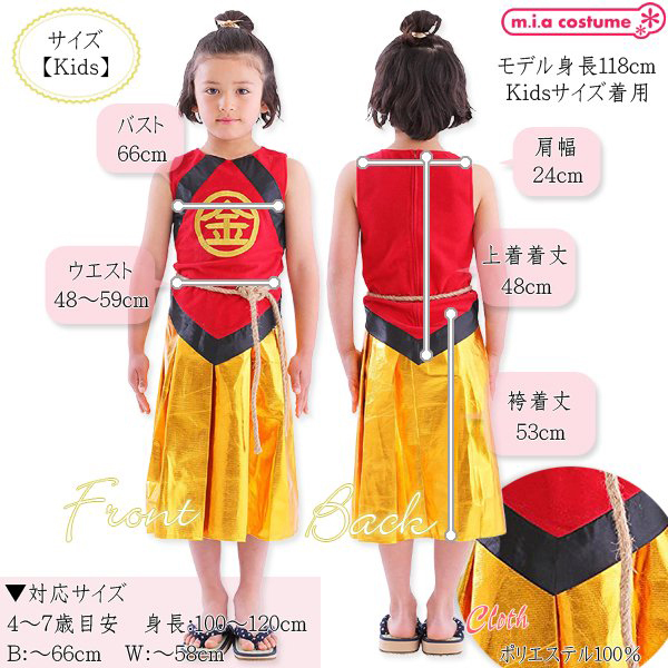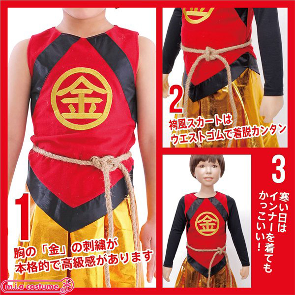 ありそうでなかった金太郎のコスチュームです♪胸の部分の「金」の刺繍が本格的で高級感があります!袴風スカートはウエストゴムで着脱も簡単♪寒い日はインナーを着用し、ベスト風に着てもかっこいいですよ。※洗濯不可、塩素系漂白剤による漂白不可、アイロン不可、ドライクリーニング不可
