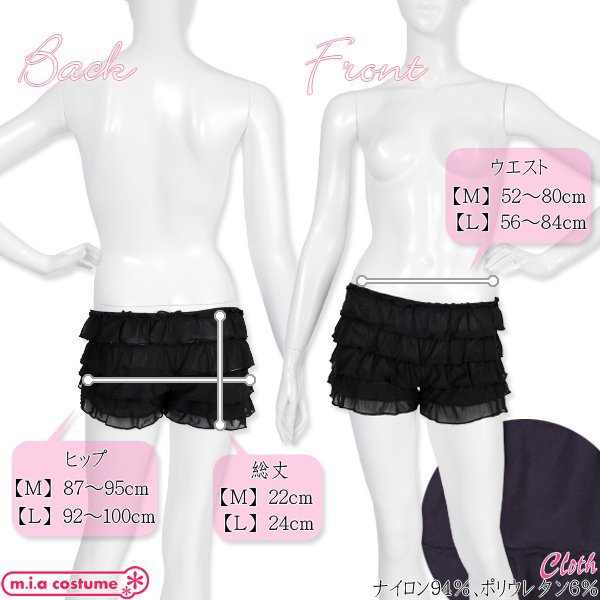 Lサイズ W56〜84cm・H92〜100cm・総丈24cm セット内容:ペチコートパンツ単品(ウエストゴム) 素材:ナイロン94%、ポリウレタン6% モデル身長162cm