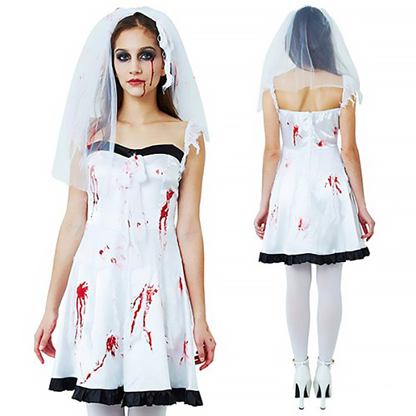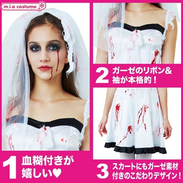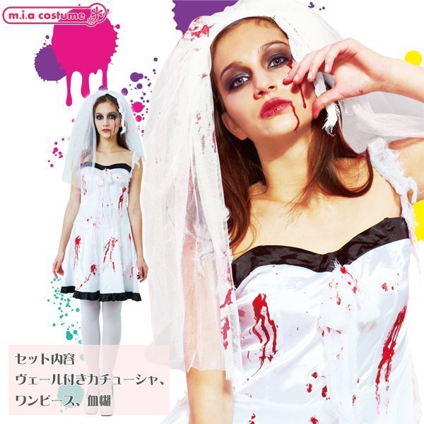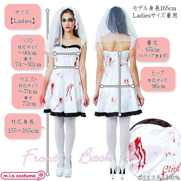 血まみれで恐怖の結婚式!血だらけの花嫁コスプレです♪ゾンビ・ホラー系の仮装コスチュームとして、ハロウィンパレードやお化け屋敷、仮装イベントにどうぞ!ウェディングドレス風の衣装で血糊はお好みでアレンジ♪ハロウィンのコスプレにもぴったりです。※商品写真は参考例として血糊でアレンジ後の画像となりますので、ご注意ください。※水洗い不可、塩素系漂白剤による漂白不可、アイロンは低温で当て布使用、ドライクリーニング不可、色落ちの可能性があります。※商品写真は参考例として血糊でアレンジ後の画像となりますので、ご注意ください。※こちらの商品は在庫の状況によりお届けまでに4日〜7日程度かかる場合がございます。