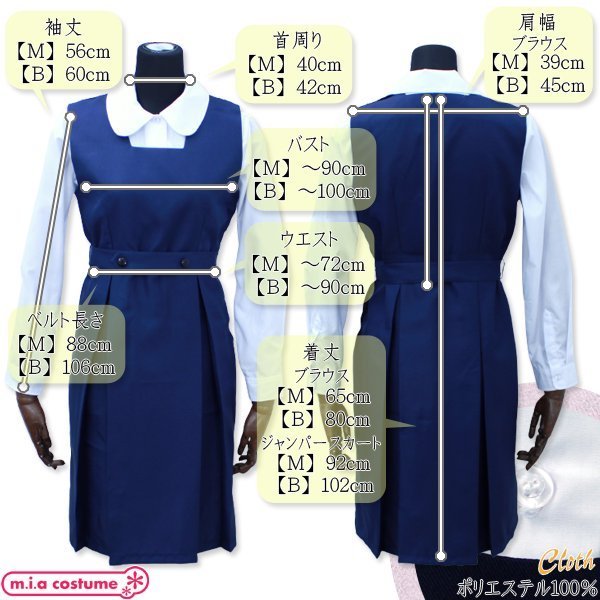 BIGサイズ:B〜100cm・W〜90cm・ブラウス着丈80cm・ジャンパースカート丈102cm・袖丈60cm・肩幅45cm・首周り42cm・ベルト106cm セット内容:ブラウス(前ボタン)、ジャンバースカート(裏地有り・脇と肩スナップボタン留め)、ベルト 素材:ポリエステル100%