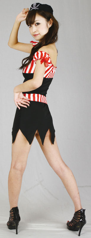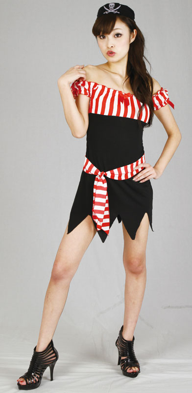 際どいスカートの裾からチラリと見えるのはTバック!セクシーかつクールにキメる、女船長コスチューム!タイトな印象の黒地のワンピースは肩出しのパフスリーブ仕様、バスト周りはふんわり赤と白の太めストライプ。胸元と袖口には赤いリボンを施しキュートに!ウエストにはバスト周りと同じ、赤白ストライプ柄のベルトスカーフを巻いてオシャレに!ドクロの描かれた帽子を被って、パイレーツ気分で仮装パーティーやイベント会場で暴れちゃおう!※サイズはおおよその目安となります。表記のサイズを基準に前後でお考え下さい。